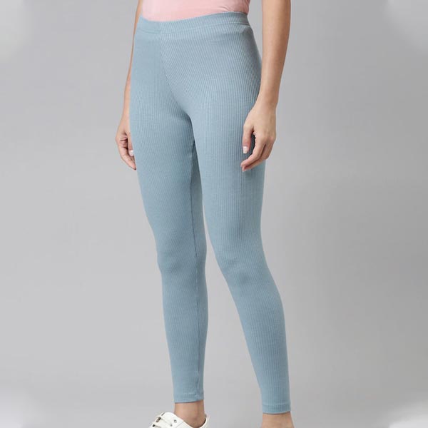 Blue solid ankle-length ribbed leggings, has an elasticated waistband and slip-on closure
